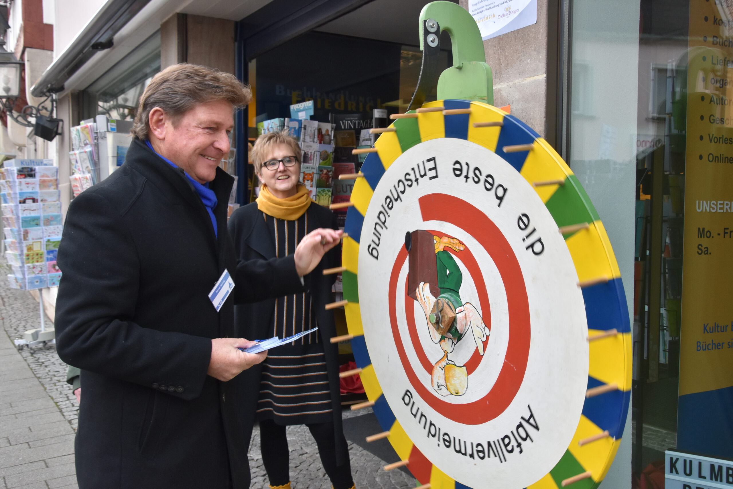 Bereits kurz darauf organisierte ich vom Kulmbacher Kreisjugendring das Glücksrad, auf welches mich Sabine Kaim von Herzstücke aufmerksam machte. Parallel hierzu sammelten Abou und ich kleinere und auch größeres Sachspenden verschiedenster Sponsoren ein, um diese mittels des Glücksrades an die Frau und an den Mann zu bringen. Ebenso wurden in dieser Zeit Einladungen per Post verschickt. Wir hatten wohl beide nicht allzu viel Freizeit während des Jahreswechsels übrig. Doch als die ersten Plakate, welche ich in der mediasyle werbeagentur drucken ließ, bei unseren Sponsoren in den Schaufenstern hingen, verspürten wir einen ersten Erfolg! Die Preise sammelten sich an und Christine Friedlein von der Buchhandlung Friedrich empfing uns eines Abends. Sie stellte uns ihre Räumlichkeiten für die geplante Veranstaltung zur Verfügung und wollte zuvor ebenfalls Abou einmal persönlich kennenlernen. Für musikalische Unterstützung konnten wir Goletz & Goletz aus Untersteinach für uns gewinnen und auch mit Stephanie Paulie, welche uns an diesem Tag mit der Kamera begleitete, verbanden mich seither viele Treffen.