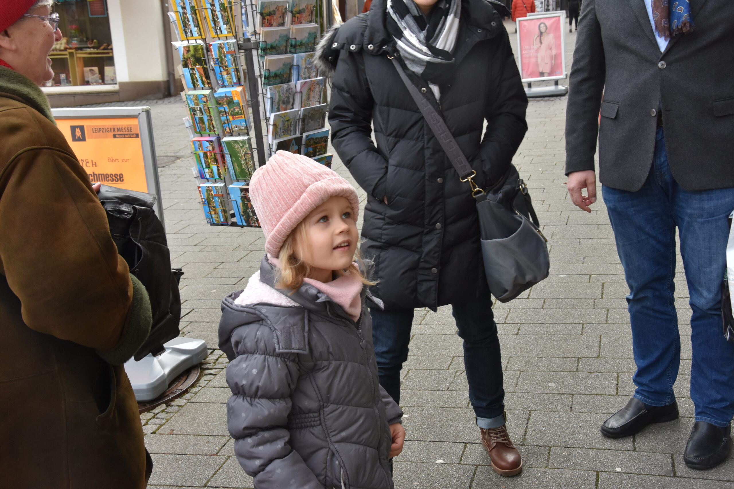 Als der große Tag näher rückte und in unserer Facebook-Veranstaltung immer mehr Zusagen eintrudelten, mussten wir jedoch einen Rückschlag in Kauf nehmen. Abou hatte einen schweren Schicksalsschlag noch in der Nacht vor unserem großen Tag zu verdauen. Ohne es sich anmerken zu lassen erschien er jedoch mit der Unterstützung seines Sohnes am vereinbarten Treffpunkt und wir begannen mit den Vorbereitungen. Die Mädels der Buchhandlung haben viele leckere Kuchen gebacken, der Kaffee wurde frisch gekocht, die Spendensau Rudi und ich standen neben unserem Glücksrad bereit. Das Wetter war ganz auf unserer Seite und die Sonne lachte mit uns. Es ergaben sich nette Gespräche mit unseren „Straßennachbarn“, da die WGK-Kulmbach ebenfalls einen Stand am Holzmarkt errichtet hatte. Der Tag verging wie im Flug. Abous Vortrag konnte auf ich aufgrund der andauernden Nachfrage unseres Glücksrades nicht mit anhören, doch als ich am Ende hereingebeten wurde, bekam ich von ihm zum Dank eine Rose überreicht, sowie alle Unterstützer, die sich für diesen Tag in Abous Namen stark machten. Ich war sehr gerührt. Meine Freunde und Familie besuchten mich an jenem Tag ebenso, wie auch die Vorstandsvorsitzende der Händlervereinigung, Frau Alexandra Hofmann.