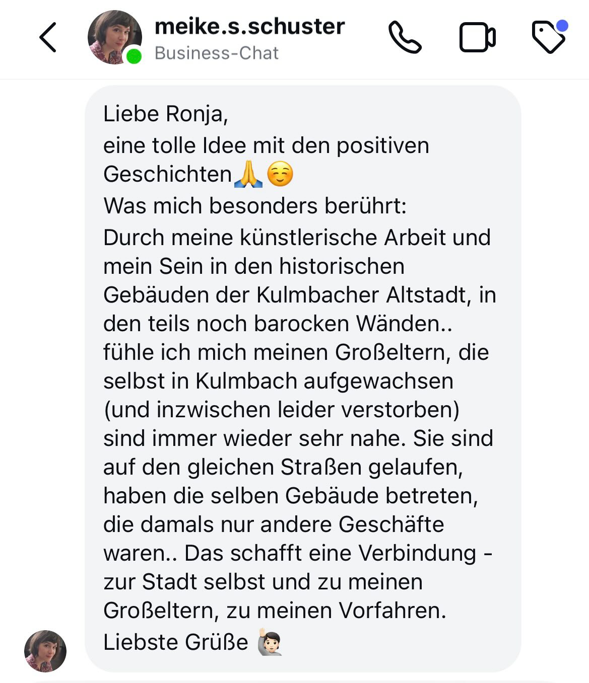 Heimatliebe Kulmbach Zeige grösseres Bild Auch die liebe @meike.s.schuster ist meinem Aufruf gefolgt. Wie schön ihre Zeilen doch nachschwingen Vielen Dank für deinen Beitrag! Schickt auch ihr mir gerne eure Geschichten. Was habt ihr in Kulmbach erlebt? #einestadteinherzschlag #kulmbach #heimatliebe Ronja Langer2026-01-26T08:07:35+01:0026. Januar 2026|Blog, Blogbeiträge Kulmbach|0 Kommentare Gerne könnt Ihr diesen Artikel auch teilen! FacebookTwitterRedditLinkedInWhatsAppTumblrPinterestE-Mail Hinterlasse einen Kommentar Antwort abbrechenKommentar Meinen Namen, E-Mail und Website in diesem Browser speichern, bis ich wieder kommentiere. Δ